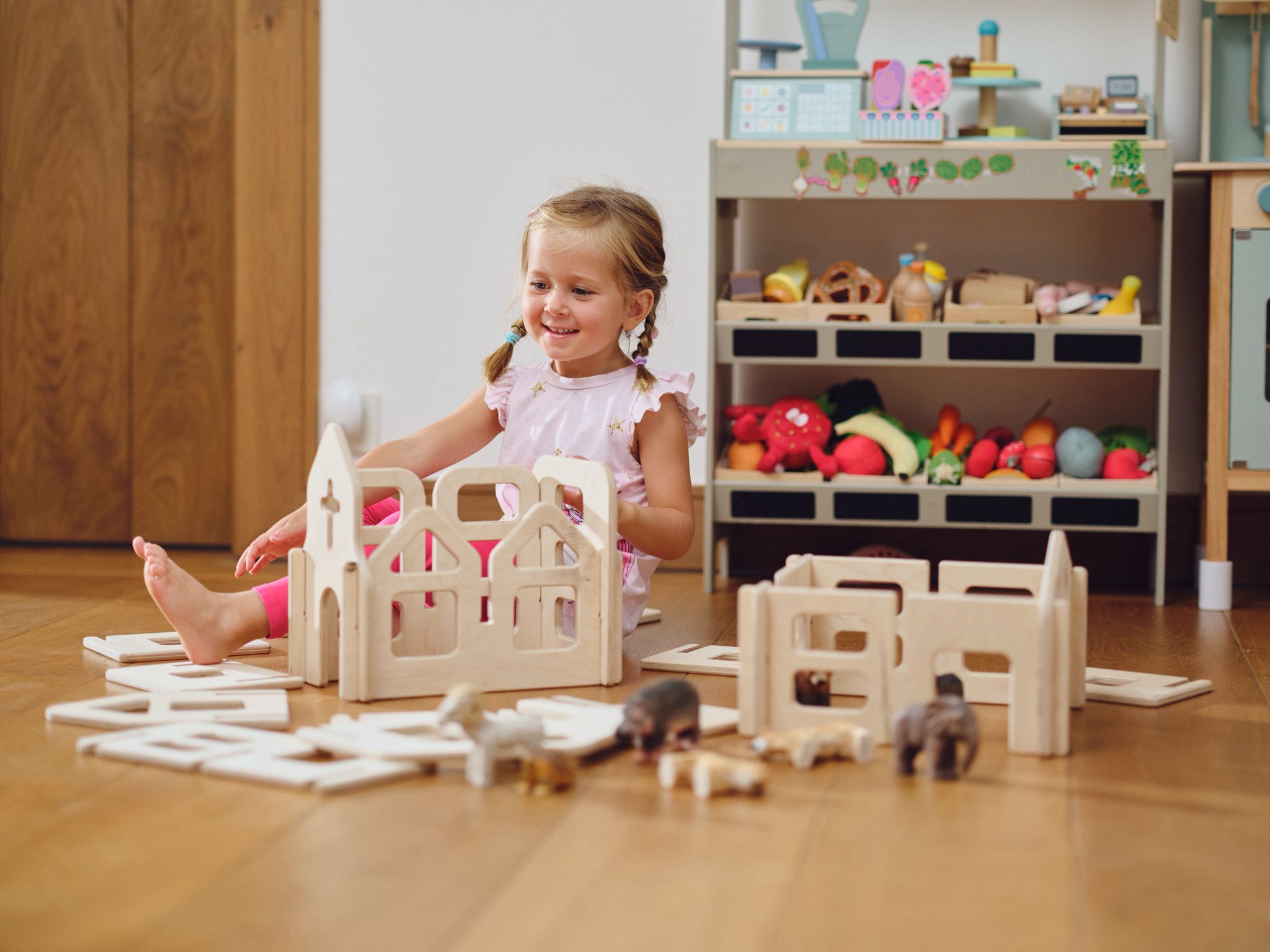 Objevte naše dřevěné městečko Wooden City. Tato stavebnice obsahuje 23 pečlivě navržených dílců, které do sebe zapadají pouze správným nasazením, takže není potřeba žádné šroubování, lepení ani montování. Vše zvládnou malé dětské ručky bez větší námahy! Tato stavebnice je další z BaaVi řady kvalitních open ended hraček. Umožňuje dětem rozvíjet fantazii, koordinaci a jemnou motoriku, zatímco se baví stavěním jednotlivých domečků, kostelíků, garáží, ohrad pro zvířátka nebo celých měst. Tato stavebnice je ideální pro všechny malé tvůrce, kteří chtějí vytvářet vlastní světy plné dobrodružství.