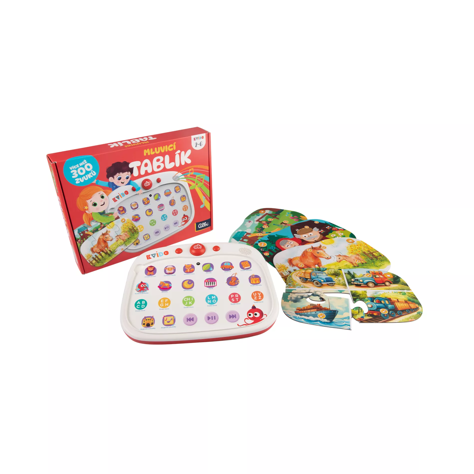 Unikátní novinka pro děti od 2 do 6 let – dotyková tabulka se zvuky a kvízy. Tablík, který je v českém jazyce, je doplněn o pohádky a písničky v angličtině. DMOC 999 Kč, plast, funguje na 3 baterie typu AAA.